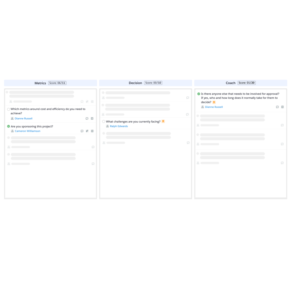 - Stage-independent scorecards for organizations that follow custom variations of popular sales frameworks